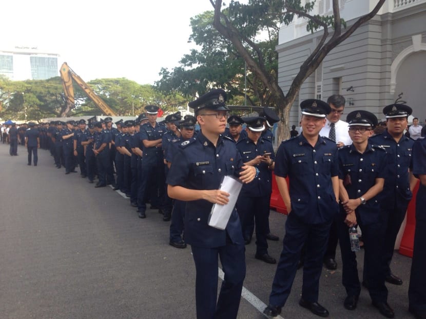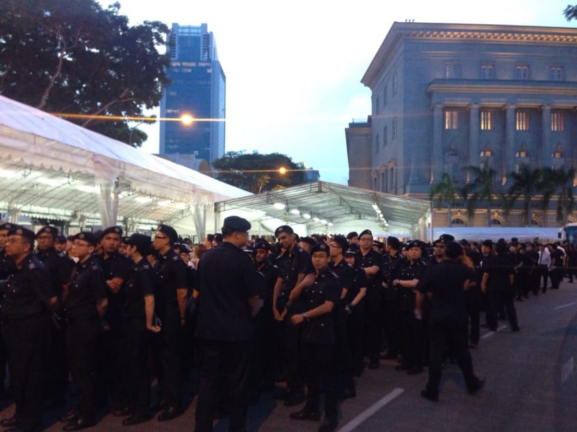 1.26pm: Security screening stations have been set up at the Promenade next to Parliament House for the Lying in State, police say. The queue is currently extended to Circular Road. The public is advised to exit at Clarke Quay MRT Station to join the queue for the Lying in State.