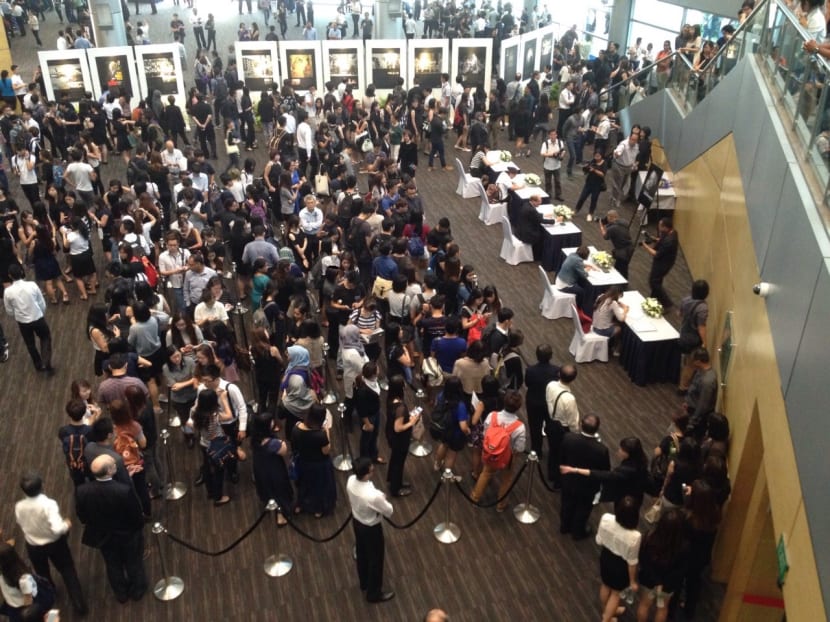 4.55pm: A crowd gathers at Nanyang Technological University, as students, staff and alumni wait in line to sign condolence books. They also view the sketch of former prime minister Lee Kuan Yew by artist Ong Yi Teck who wrote Mr Lee's name 18,000 times.