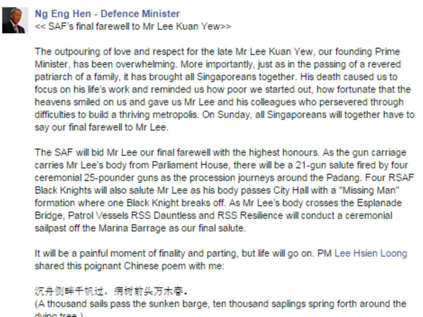 6.44pm: Defence Minister Ng Eng Hen gives details of Sunday's State Funeral procession on his Facebook page.