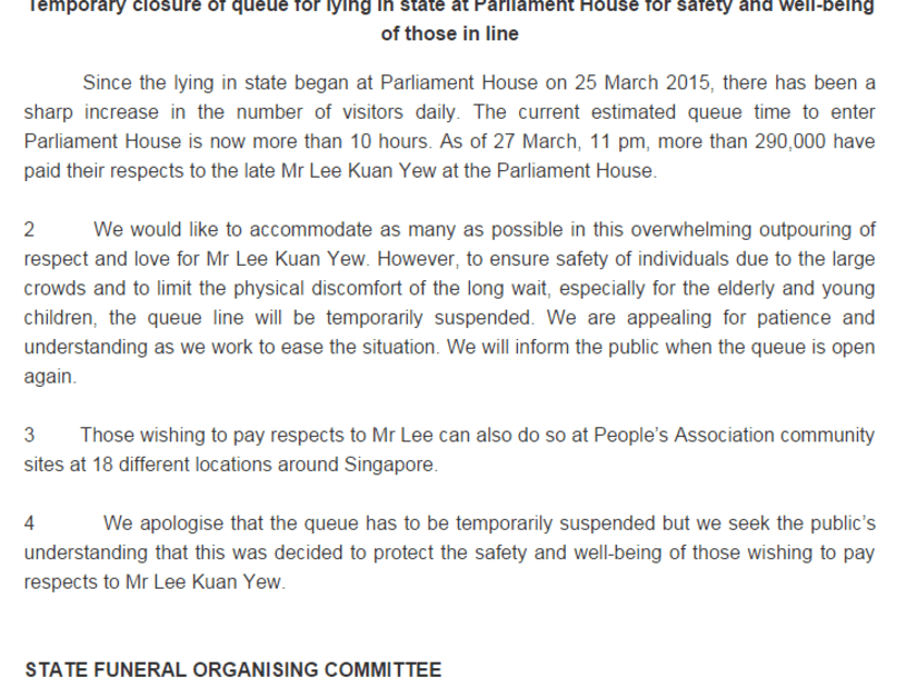 3.05pm: Queue update: To accommodate a surge in the crowd numbers, the queues will be extended towards Marina Bay if necessary, organisers have just announced in a post on Remembering Lee kuan Yew's Facebook page.