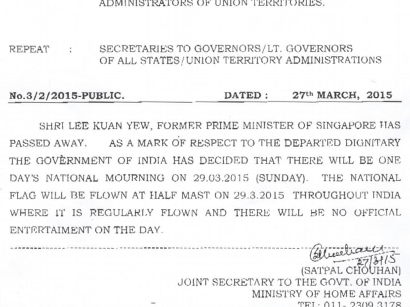 7.30pm: The Indian Government has declared a day of national mourning on Sunday (March 29) as a mark of respect to the late Mr Lee Kuan Yew. The Indian National Flag will be flown at half-mast throughout the country and there will be no official entertainment on that day, an official statement said. Prime Minister Narendra Modi will be attending the funeral.