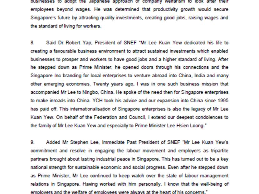 In a statement today (March 23), the National Trades Union Congress (NTUC) paid tribute to the former Minister Mentor’s support for Singapore’s unions.