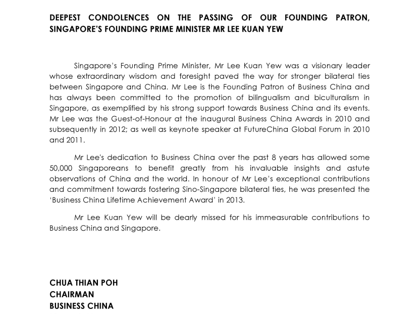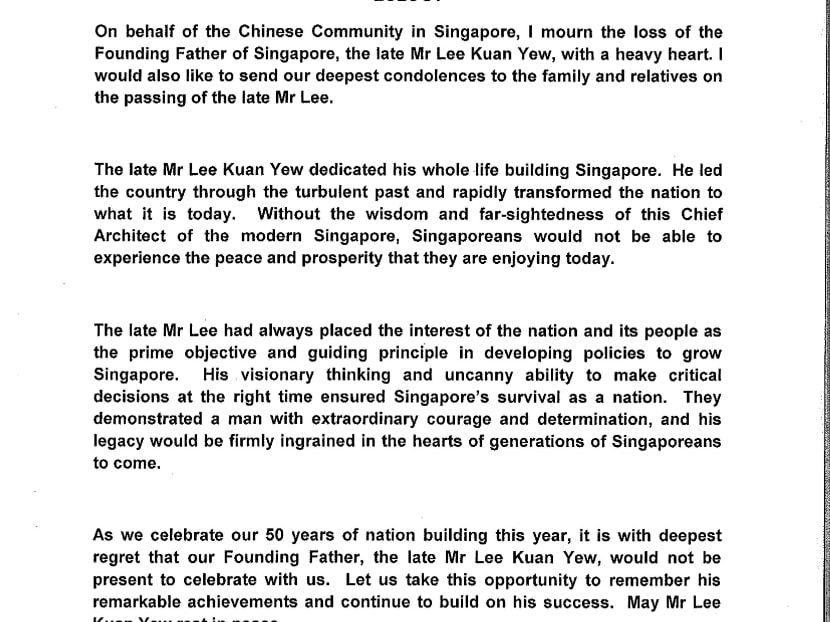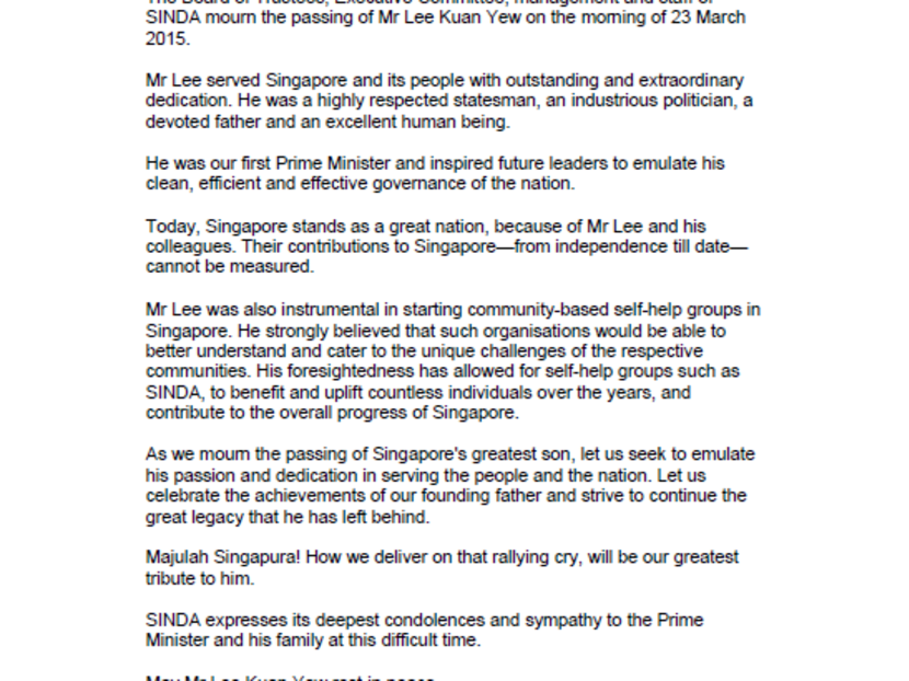 Mr Lee touched the lives of all Singaporeans in a profound way. YSA has long been inspired by the visionary leadership displayed and achievements attained for our nation by Mr Lee and we will continue to help keep his legacy alive by promoting and working towards a Singapore that is united and resilient where there is respect for one another.