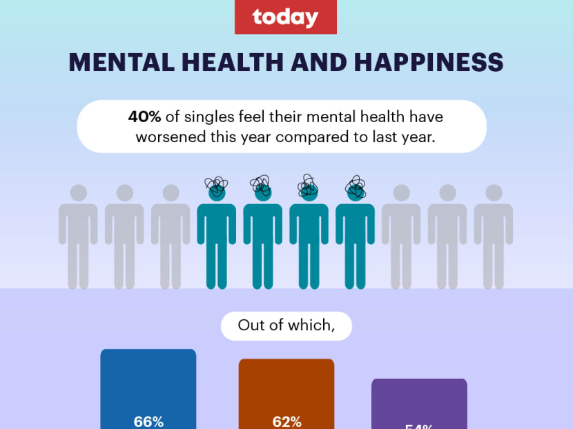 SINGAPORE — Two in five singles in Singapore say their mental health has worsened this year, a survey has found. And of those, two thirds say they are lonely and more than half feel stressed or stuck.