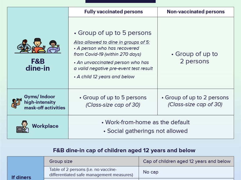 Finance Minister Lawrence Wong, who co-chairs the task force, said that people who are not fully vaccinated would be allowed to join a group of five provided that they have tested negative for Covid-19 on a pre-entry test or had fully recovered from Covid-19 and hence have immunity against the coronavirus.