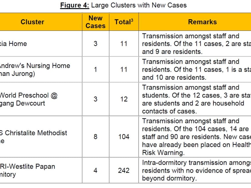 Among large clusters that are being closely monitored by the ministry, five had new cases, MOH said on Thursday. This was three more clusters with new cases compared to Wednesday.
