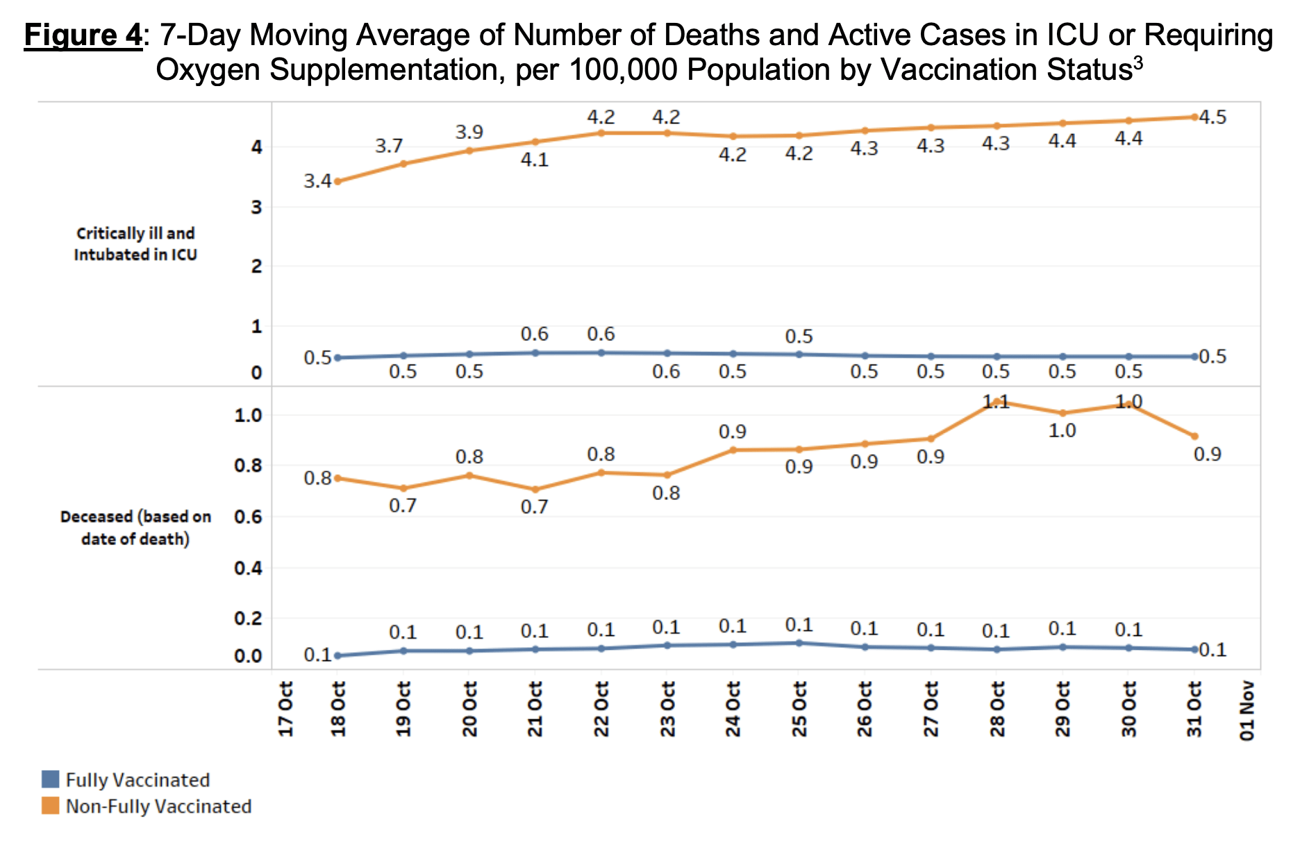 Over the past seven days, the number of fully vaccinated and non-fully vaccinated cases who are critically ill in the ICU are at 0.5 and 4.5 per 100,000 population respectively.
