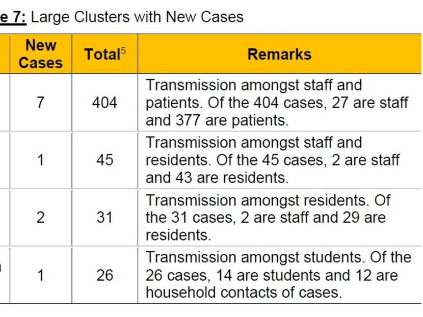 Notably, the cluster at the Institute of Mental Health has grown to 404 cases after seven new infections were detected there on Tuesday. Of the cases there, 377 are patients at the psychiatric hospital and the remaining 27 are workers.