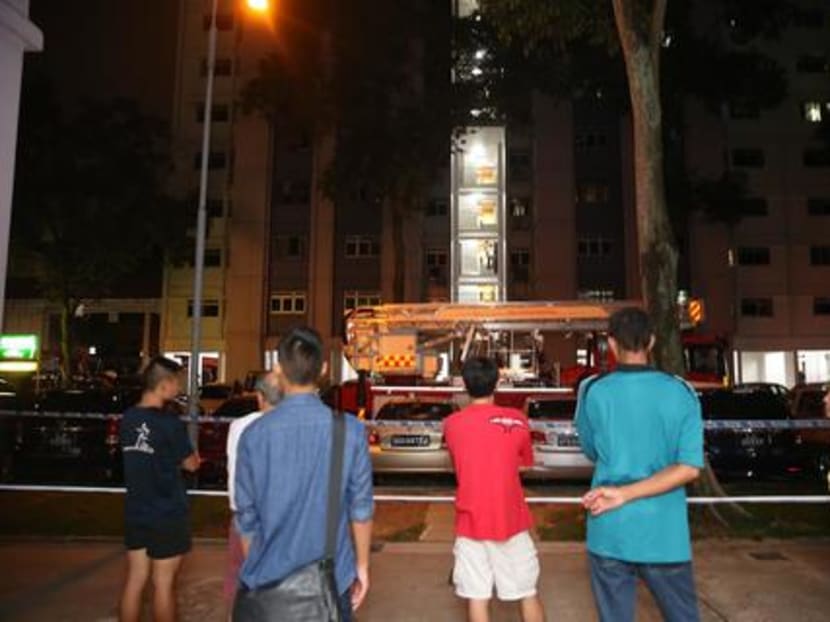(Above: Residents gather in front of a block where a fire broke out on the fifth floor bedroom of a flat at Blk 818 Woodlands Street 82. Photo: Wee Teck Hian/TODAY)