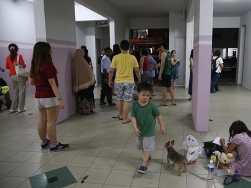(Above: Residents gather under a block after a fire broke out on the fifth floor bedroom of a flat at Blk 818 Woodlands Street 82. Photo: Wee Teck Hian/TODAY)