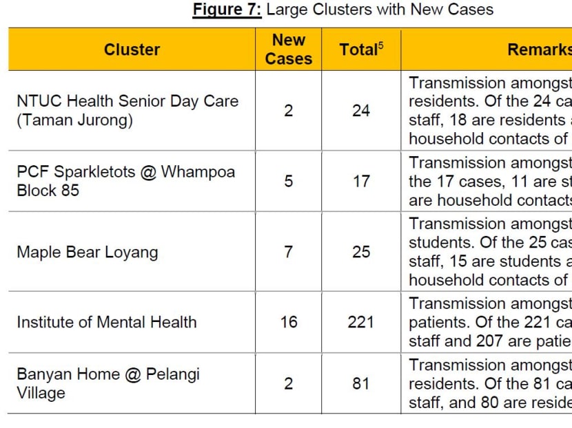 Notably, there were 16 new cases linked to the cluster at the Institute of Mental Health, bringing the tally there to 221. Of the 221 cases, 207 are patients of the psychiatric hospital and the remaining 14 are workers there.