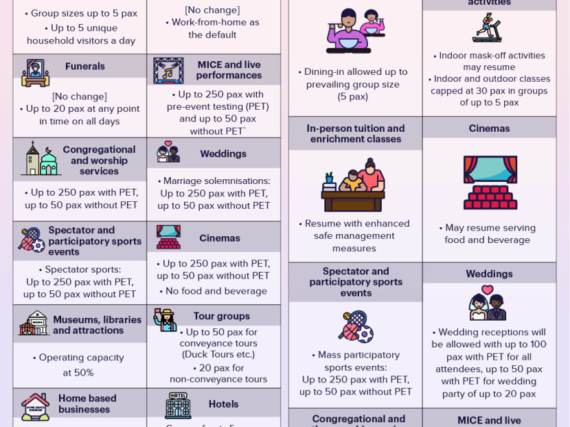 SINGAPORE — From June 14, the maximum size of social gatherings and the number of distinct visitors to households in a day will be increased to five from the current two.