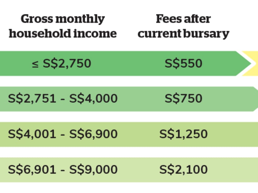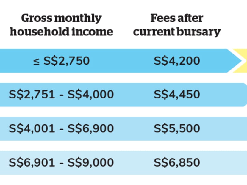 The student currently pays S$4,200 in net tuition fees a year after the current bursary subsidies. But with the increased bursary, he or she will need to pay S$2,000 in net tuition fees a year.