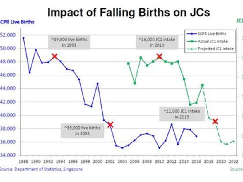 Correspondingly, demand for school places has been dropping. Enrolment in JCs is expected to decline by some 20 per cent between 2010 and 2019, from about 16,000 to about 12,800.