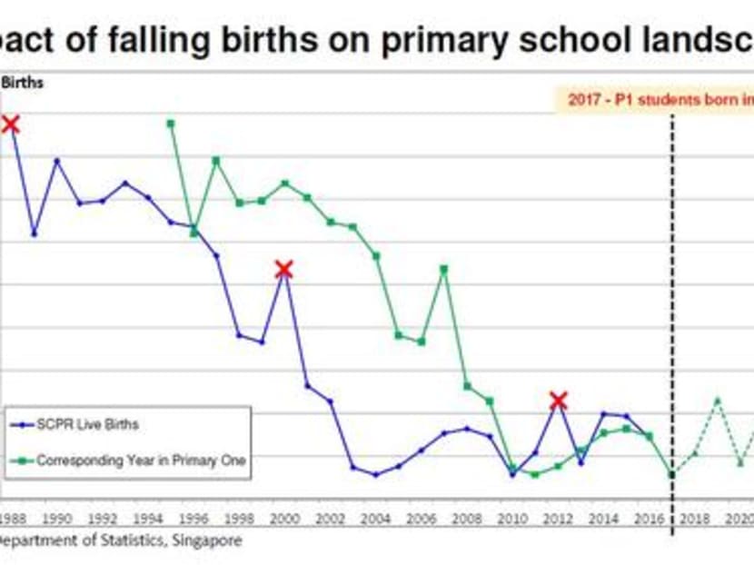 MOE said that the number of babies born each year has fallen from about 50,000 in '80s and '90s, to about 37,000 this year.