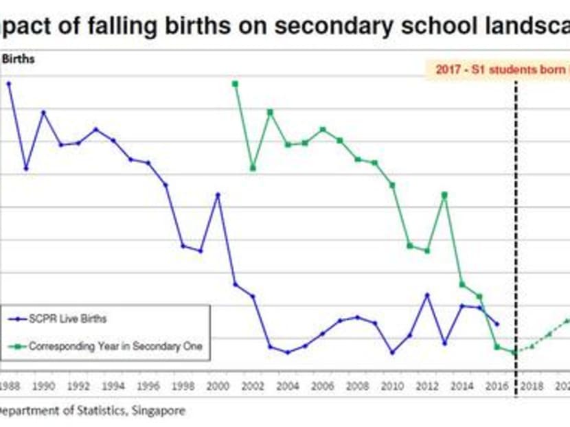 In response to falling birth rates and shrinking cohort sizes, three pairs of secondary schools and seven pairs of primary schools will be merged, while Serangoon JC, Jurong JC, Tampines JC and Innova JC will be subsumed by Anderson JC, Pioneer JC, Meridian JC and Yishun JC, respectively.