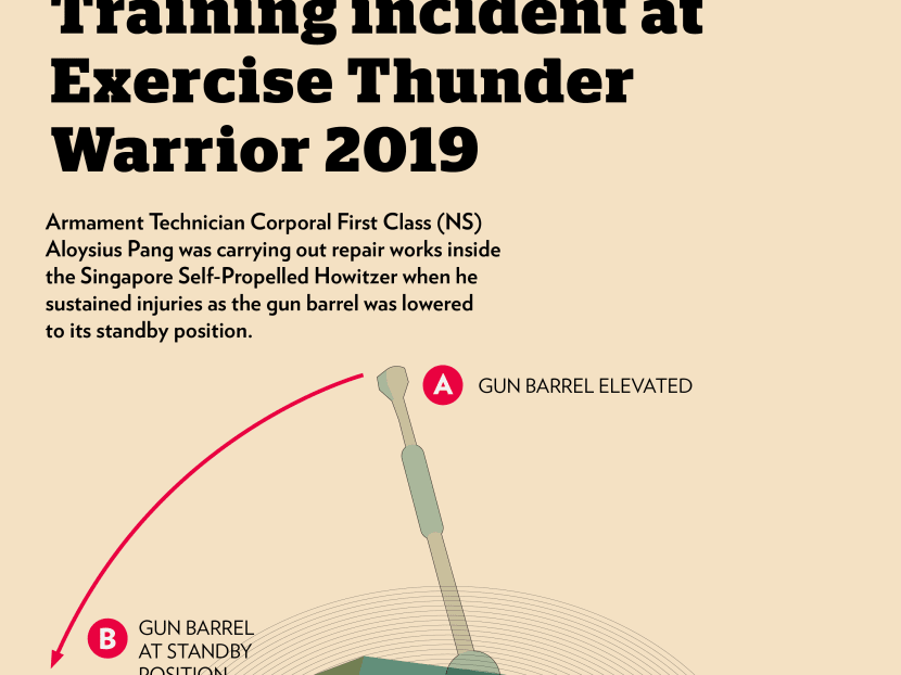 Corporal First Class (National Service) Pang and two teammates were trying to diagnose a suspected fault in the gun, when he was caught between the end of the gun barrel and the cabin of the vehicle, and sustained "crush injuries", Major-General Goh told reporters at a media conference.