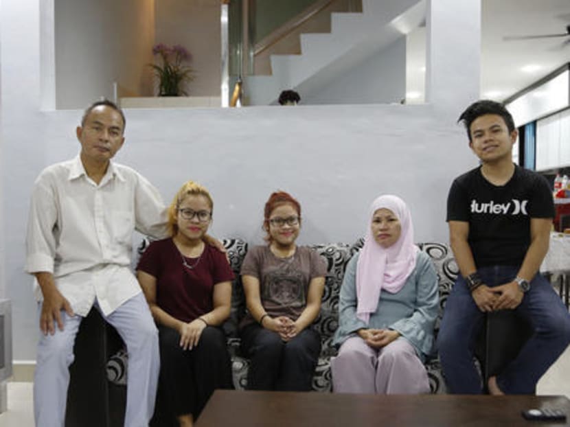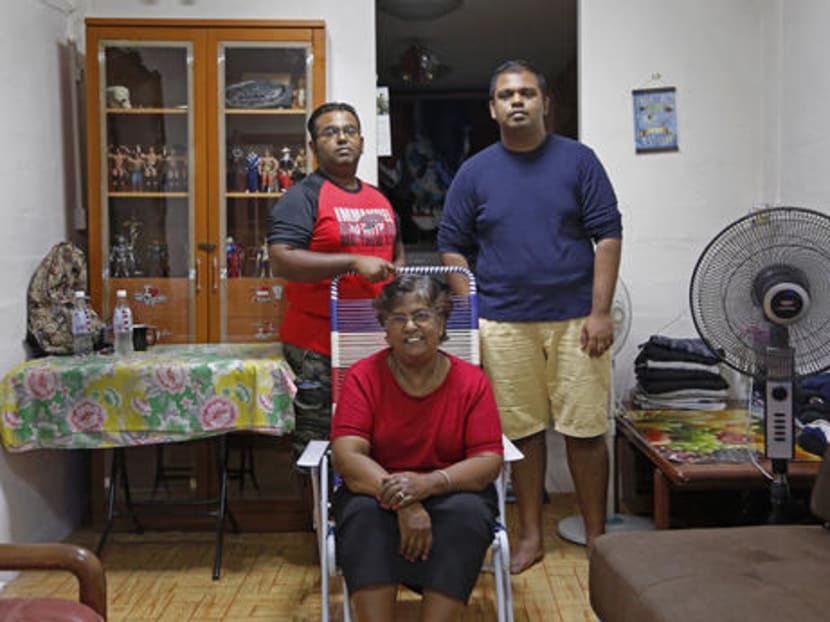 From left) Madam Vanaja Ramanathan (seated) with her sons Vasanthan and Logindran Balachandran in their rented flat in Singapore. The Anuar family who live in Johor: Erwin Isqandar Anuar, Madam Zainon Saini, Eleana Adriana, Mr Samsul Anuar, Edlyn Adriana. Photos: Raj Nadarajan/TODAY