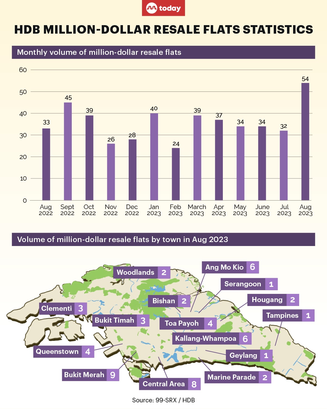 - A record 54 Housing and Development Board flats sold for more than S$1 million on the resale market in August