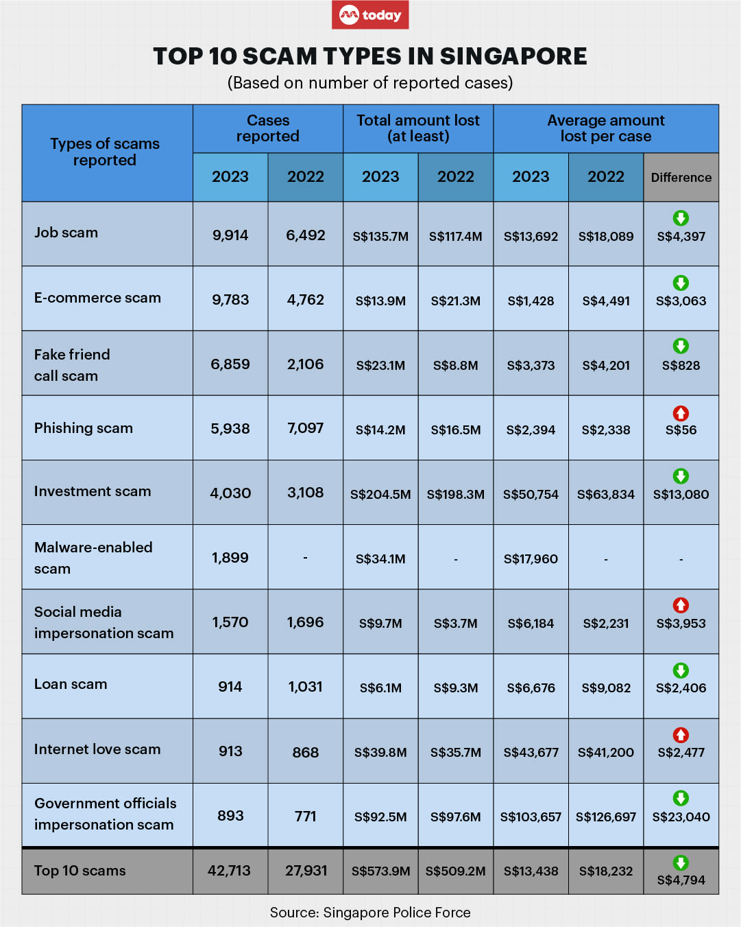 Job scams (9,900 cases), investment scams (4,000) and internet love scams (900) are among the top 10 scams in 2023, out of almost 43,000 scams.