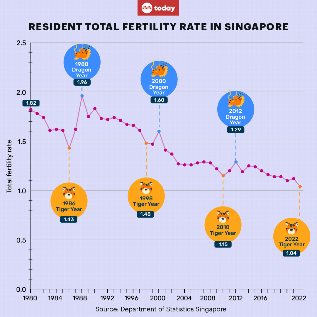 Analysts told TODAY last year that the figure was not alarming because it had been the Year of the Tiger when birth rates traditionally plunge. They added that they expected the TFR to climb in 2024, which is the Year of the Dragon. This is traditionally a time when birth rates in Singapore tend to jump, because it is seen as an auspicious year for some Chinese families who go by the horoscope that is linked to the Chinese lunar calendar.