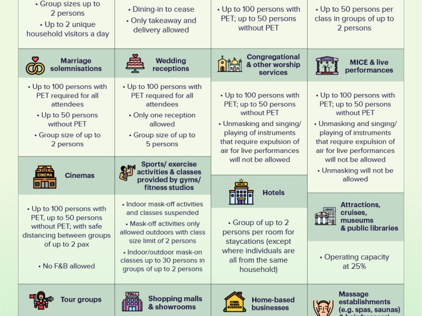 SINGAPORE — Social gathering sizes will be capped at two persons and dining-in will be banned from Thursday (July 22) to Aug 18, as the authorities seek to put a lid on the recent spike in Covid-19 cases in the community.