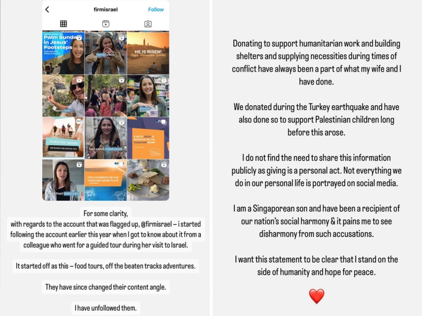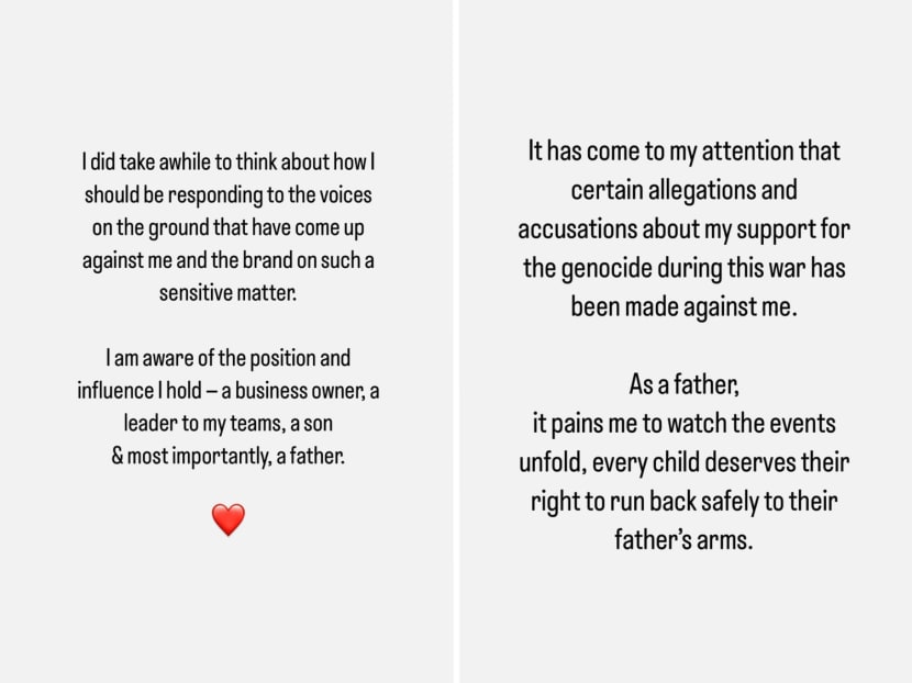In response, Mr Chew posted a series of Instagram Stories on his personal account last Thursday, stating: "It has come to my attention that certain allegations and accusations about my support for the genocide during this war have been made against me.