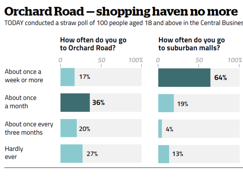 In a TODAY straw poll of 100 people aged 18 and above in the Central Business District, 17 respondents said they go to Orchard Road at least once a week. In comparison, 64 said they go to suburban malls at least once a week, while 19 shop online once a week or more. Among other findings, almost half of the respondents said they go to the shopping belt only about once every three months, or hardly ever.