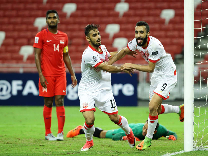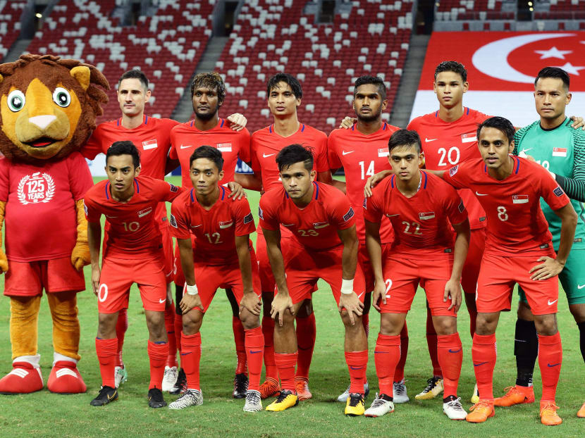 The Singapore team sing the national anthem during the 2019 Asian Cup Qualifier match between Singapore and Bahrain at National Stadium on November 14, 2017 in Singapore. Photo: Getty Images