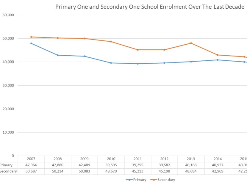 Similarly, the number of students entering Secondary 1 is on the slide. This year, about 35,000 pupils embarked on their secondary school education — the lowest since 1960, when enrollment was 20,842.