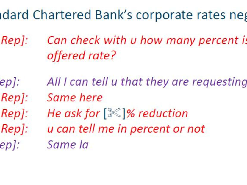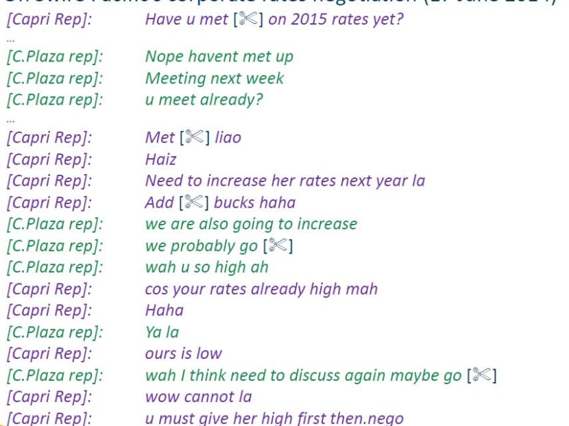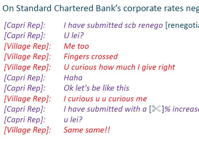 For example, a WhatsApp screenshot showed the sales representatives from Village Hotels and Capri discussing their discount negotiations with Standard Chartered Bank.