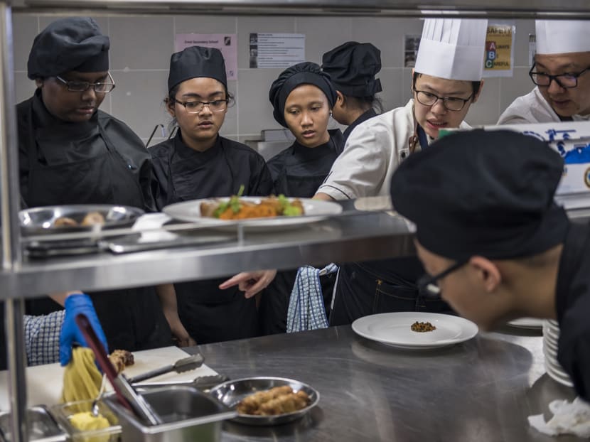 At Crest, hospitality services students start with the basics, such as learning to stir-fry rice or cook pasta. In Secondary Three and Four, they hone their skills further by mastering a grilled ribeye steak or sauteeing asparagus, and learn dining etiquette and the setting of tables, said Ms Chang.