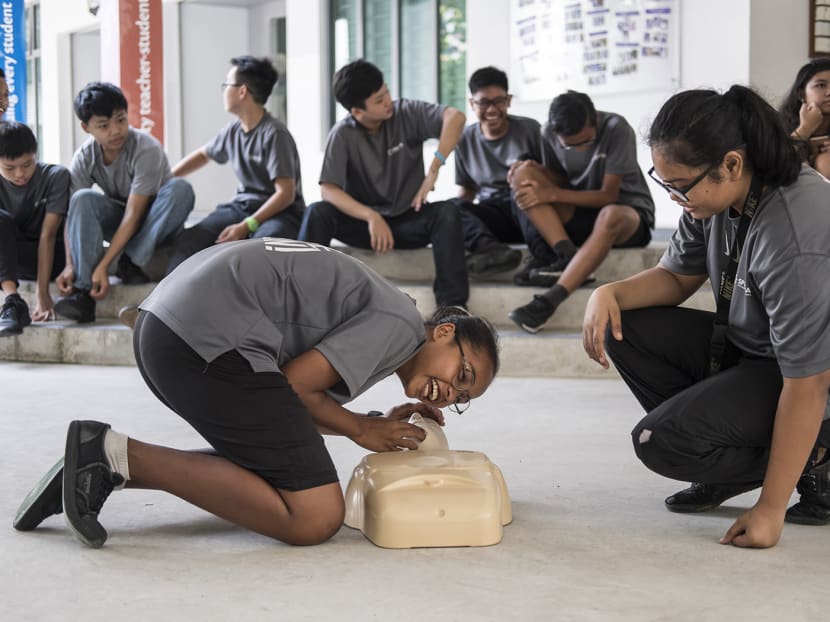 A Secondary 2 class at Spectra Secondary learn basic first aid skills during a physical education lesson. Photo: Nuria Ling/TODAY