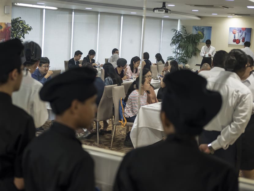 SINGAPORE — Secondary Three student Lee Hui Ling, 15, was jittery. Ahead of her was the big task for the day – to keep track of customers’ orders for the two-course French cuisine-inspired meal and relay them back to the kitchen stations.