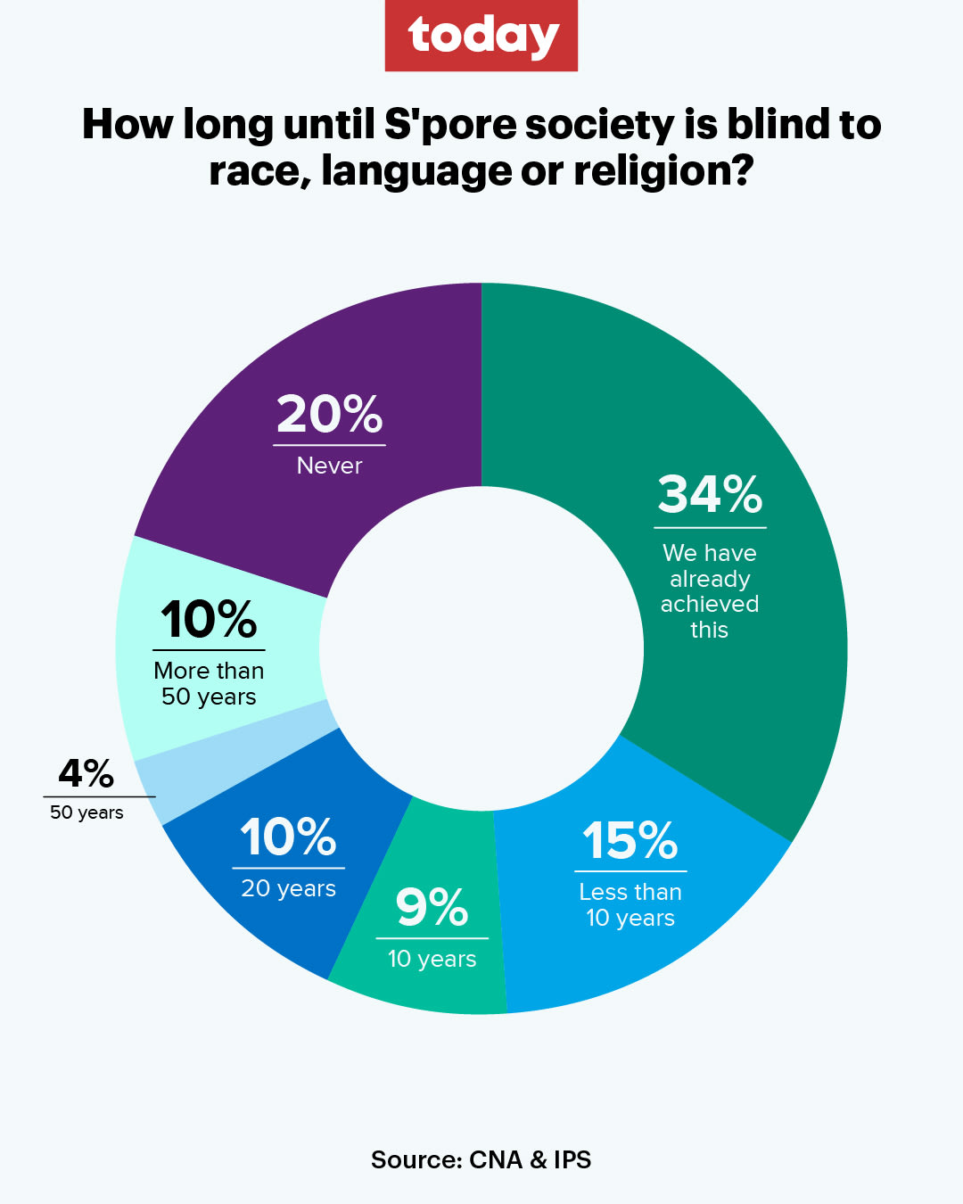 Some 2,000 people, aged 21 and above, were polled, among other topics, on how long they felt it may take before there is no longer racial discrimination in Singapore, and whether society has truly become, as the national pledge goes, “regardless of race, language, or religion”.