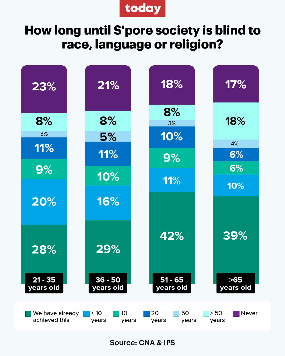 For instance, about two in five (around 40 per cent) of the respondents from each of the two oldest groups — 51 to 65 years old, and those above 65 — felt that Singapore has already achieved this.