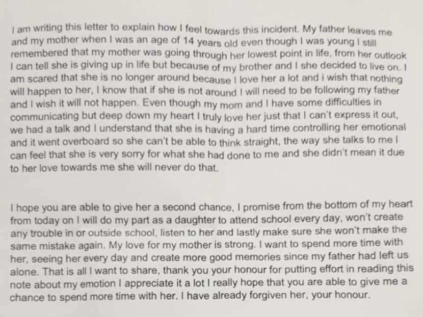 The teenager wrote: “My love for my mother is strong. I want to spend more time with her, seeing her every day and create more good memories since my father had left us alone… I have already forgiven her, your honour.”
