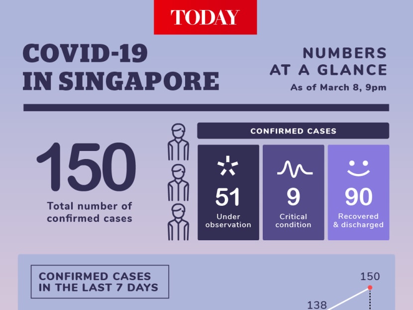 Thirty of the confirmed cases (Cases 94, 96, 107, 112, 114, 115, 116, 117, 118, 120, 121, 122, 125, 127, 128, 129, 130, 131, 133, 134, 137, 139, 140, 142, 144, 145, 146, 148, 149 and 150) are linked to a private dinner function at Safra Jurong on Feb 15.