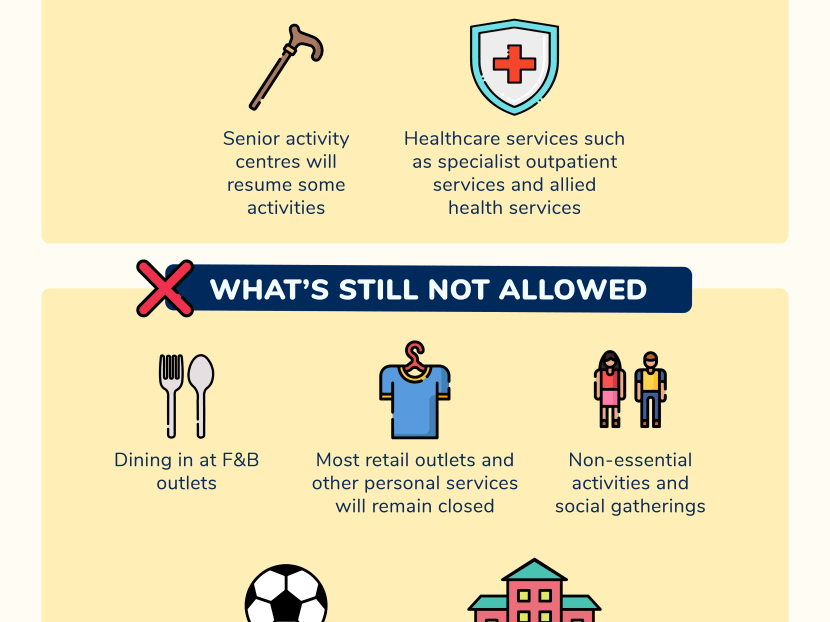 MOH stressed that dining within food-and-beverage outlets will still be disallowed during this phase and that workers should continue to telecommute as much as possible.
