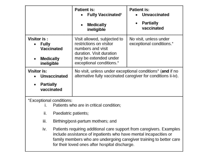 If the patient or resident or visitor, or all, are not fully vaccinated, visits will only be allowed under exceptional circumstances on a case-by-case basis, as advised by the hospitals and care homes.
