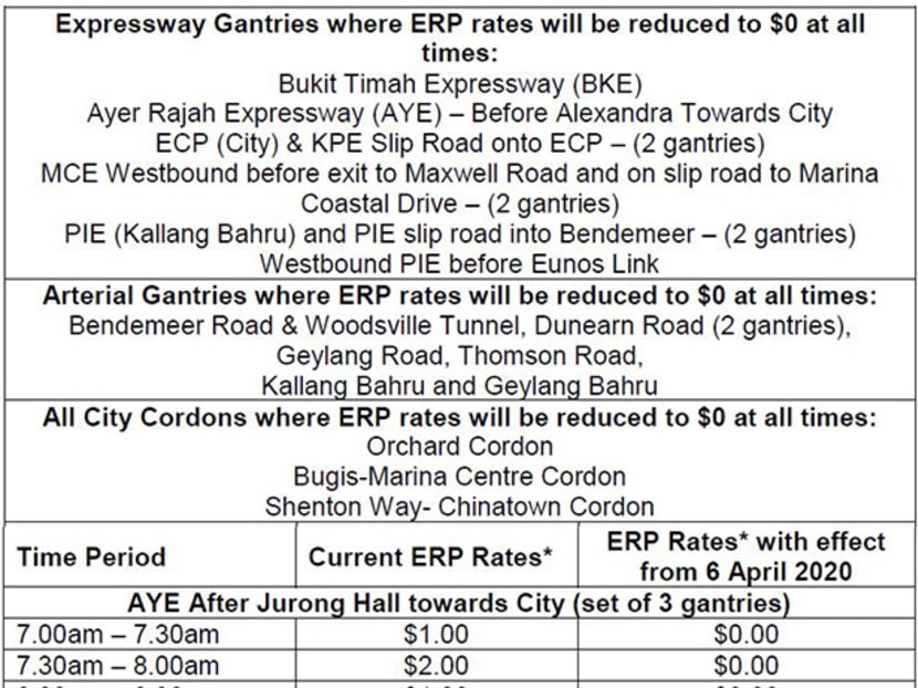 SINGAPORE — There will be no Electronic Road Pricing (ERP) charges at most gantries in light of decreased road traffic due to the ongoing Covid-19 outbreak.