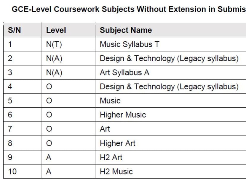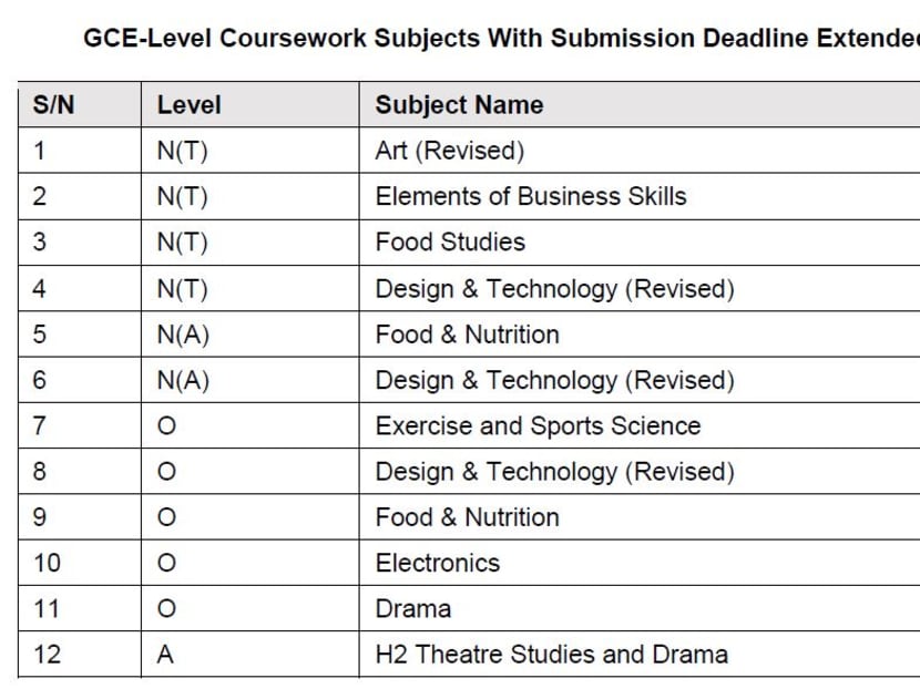 Out of 34 GCE Normal (Technical), Normal (Academic), O- and A-Level subjects with a coursework component, 12 will have their submission deadlines extended by two weeks.