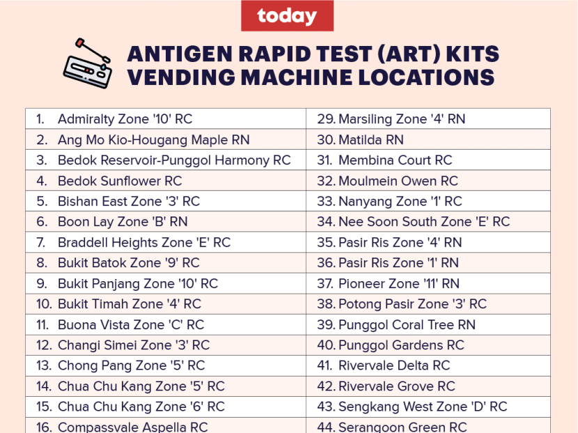 To help those issued with health risk warnings or alerts with self-testing, 100 vending machines dispensing antigen rapid test kits will be deployed at 56 locations across Singapore from Saturday.