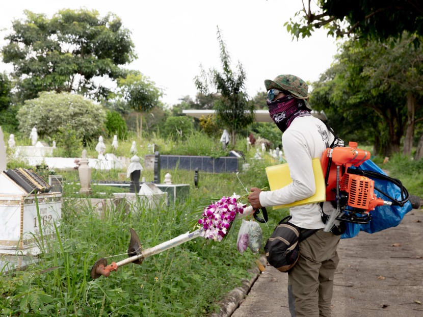 Every time he reached a grave, he would start to stamp loudly as he walked past the tall wild grass — his way of scaring away snakes — and he would also pull out weeds. Then he would use a mechanical grass cutter to trim the parameter of the grave before meticulously arranging flowers on it.