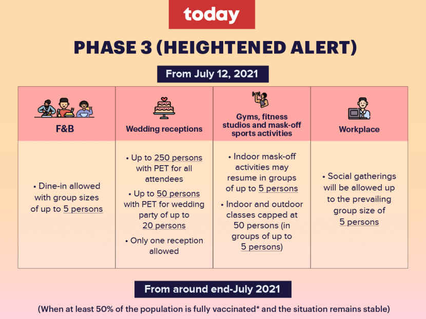 Venues and activities such as cinemas, places of worship, conferences, exhibitions, live performances, spectator sports and wedding solemnisation could also admit up to 500 people, as long as they are all fully vaccinated.