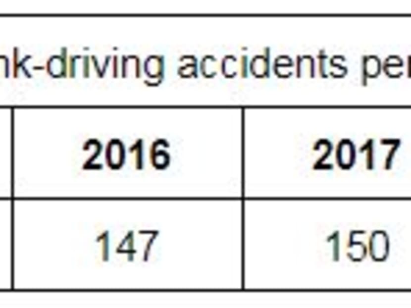 Drink driving is a growing concern and although there was a 24 per cent drop in such accidents in 2015 from the year before, there was a year-on-year increase after that, with drink-driving accidents going up 17.3 per cent from 2017 to 2018.