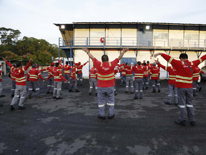 Over at the Veolia depot in Lorong Halus, Mr Sairon and his two attendants start their day at 6.30am, as he scans his thumbprint and collects the toolbox of safety checklists before joining his colleagues for a round of morning exercises and stretches.