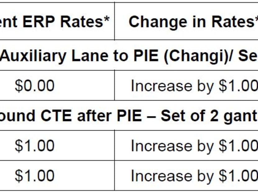 SINGAPORE — From next Monday (Aug 31), Electronic Road Pricing (ERP) charges at three gantries along the Central Expressway (CTE) will be increased by S$1 as more people travel to and from their workplaces during peak periods.