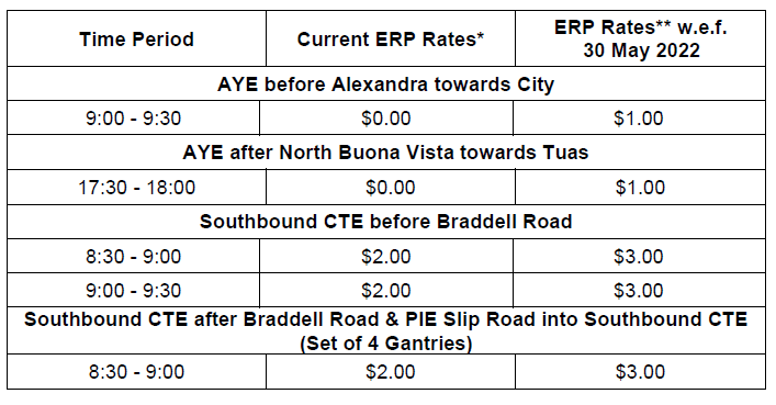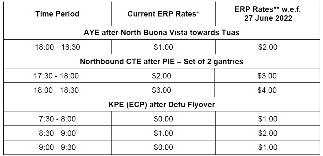 In view of the upcoming June holidays, ERP rate increases for six time periods across three locations will be implemented only after the school break, from June 27.