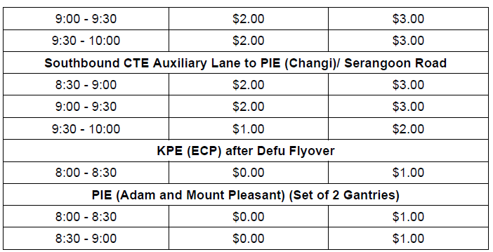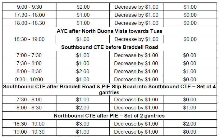 For instance, for the gantry on the AYE after North Buona Vista towards Tuas, the rate will go up to S$2 between 6pm and 6.30pm.